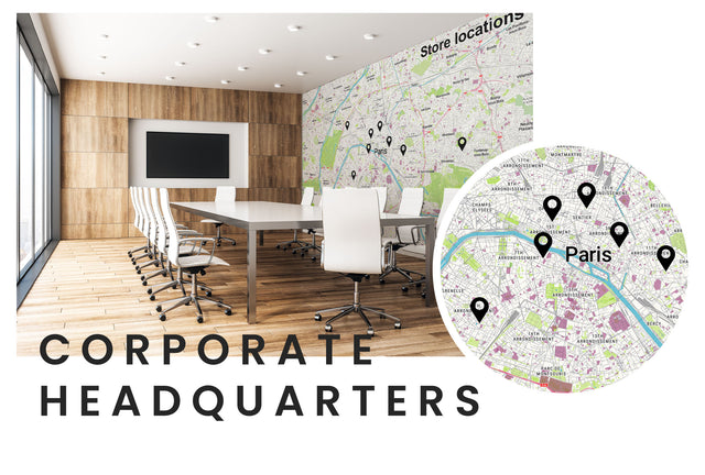 Passen Sie Ihre Karte in den Farben und dem Branding Ihres Unternehmens an, um Standorte, regionale Geschäfte oder andere Sehenswürdigkeiten hervorzuheben. Mit so viel Kontrolle über den Designprozess können Sie die Atmosphäre Ihres Unternehmens im Büro verändern.